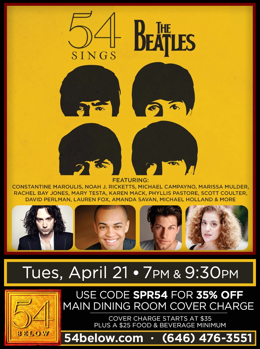 I'll be singing in an evening of Beatles songs with Mary Testa, Constantine Maroulis, Rachel Bay Jones, Scott Coulter, and more! There's going to be some incredible singing of some undeniably incredibly songs. For more info., and to order tickets, visit http://54below.com/artist/54-sings-the-beatles/